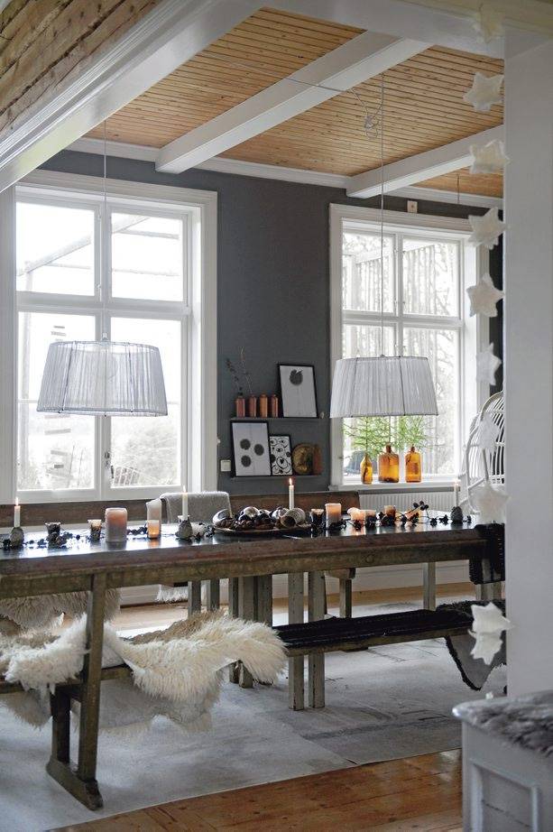 Ильва увлекается оригами, и многие елочные игрушки сделаны с использование секретов этого чудесного искусства. Также семья Шарп очень любит использовать в декорировании дома природные элементы — все то, что дарит окружающий их лес: еловые ветви, фактурные коряги, шишки сосны… На праздники в доме всегда много народа. Дружной компанией все отправляются кататься на коньках на озере Сильян или осваивать окрестные лыжные склоны, а вечера посвящены совместному творчеству и веселым играм.